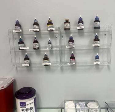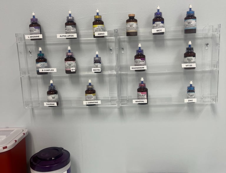 Quick, effective vitamin shots to elevate energy and immunity fast. Benefit from Vitamin B12, Vitamin C, Vitamin D3, Zinc, Biotin, Magnessium, COQ10, Vitamin Complex, AMino Acids, L-Arginine, Taurine, Mineral Boost, Libido Boost, Glutathione, NAD+, Tri-Immune and more.
